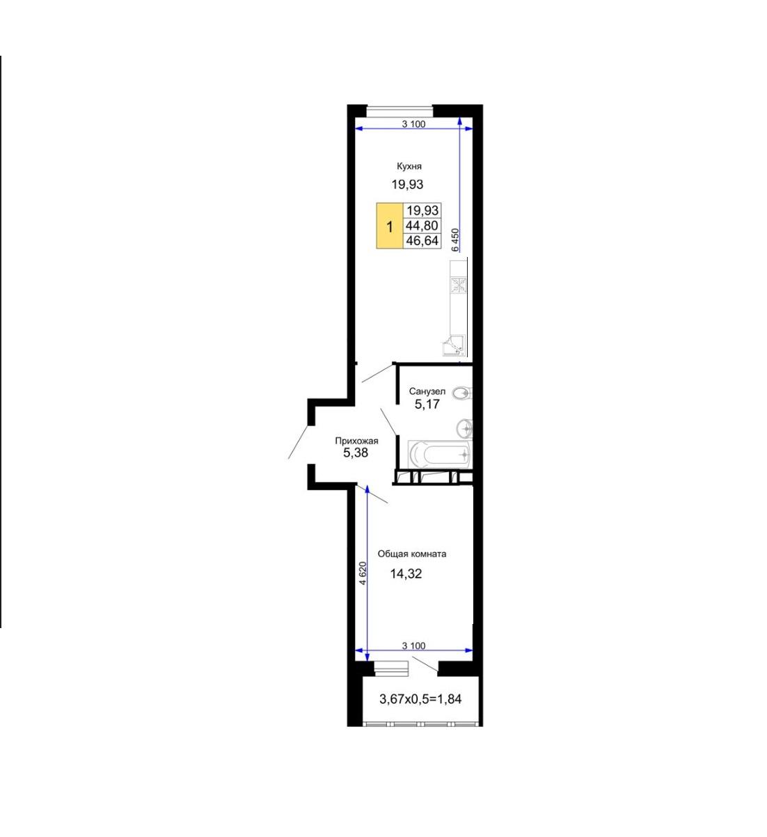Продается однокомнатная новостройка, 46 кв.м., 5/18 эт