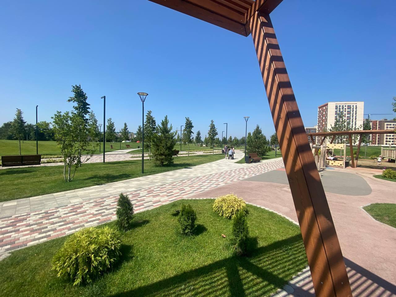 колясочная зона и помывочная для лап собачек .так же есть площадки для собак. продуманный ландшафтный красочные детские площадки и, много зелени и свежего воздуха.