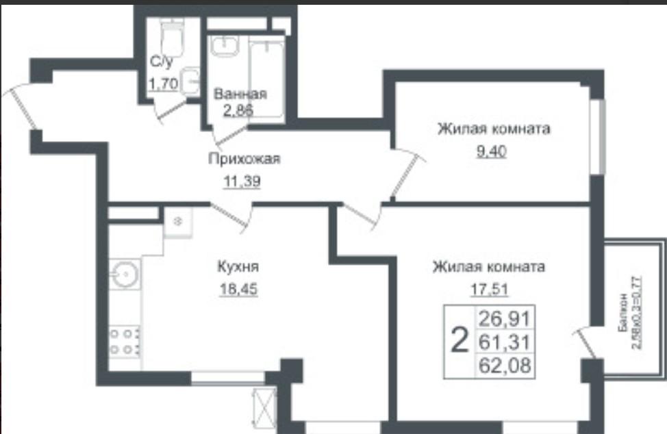 Продается 2-х комн. новостройка, 61 кв.м., 5/9 эт