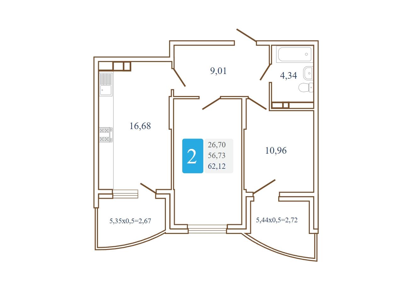 Продается 2-х комн. новостройка, 66 кв.м., 8/16 эт