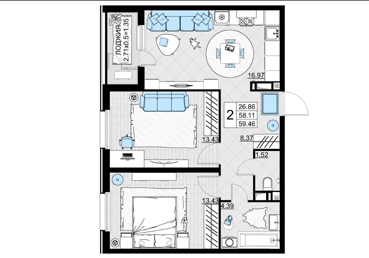 Продается 2-х комн. новостройка, 61 кв.м., 9/21 эт