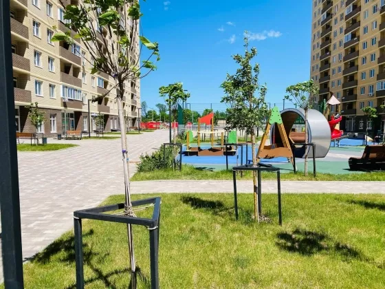 Продаётся уютная квартира в новом комплексе в спальном районе города, современная планировка с большими кухнями , красивая аллея ландшафтным дизайнером,