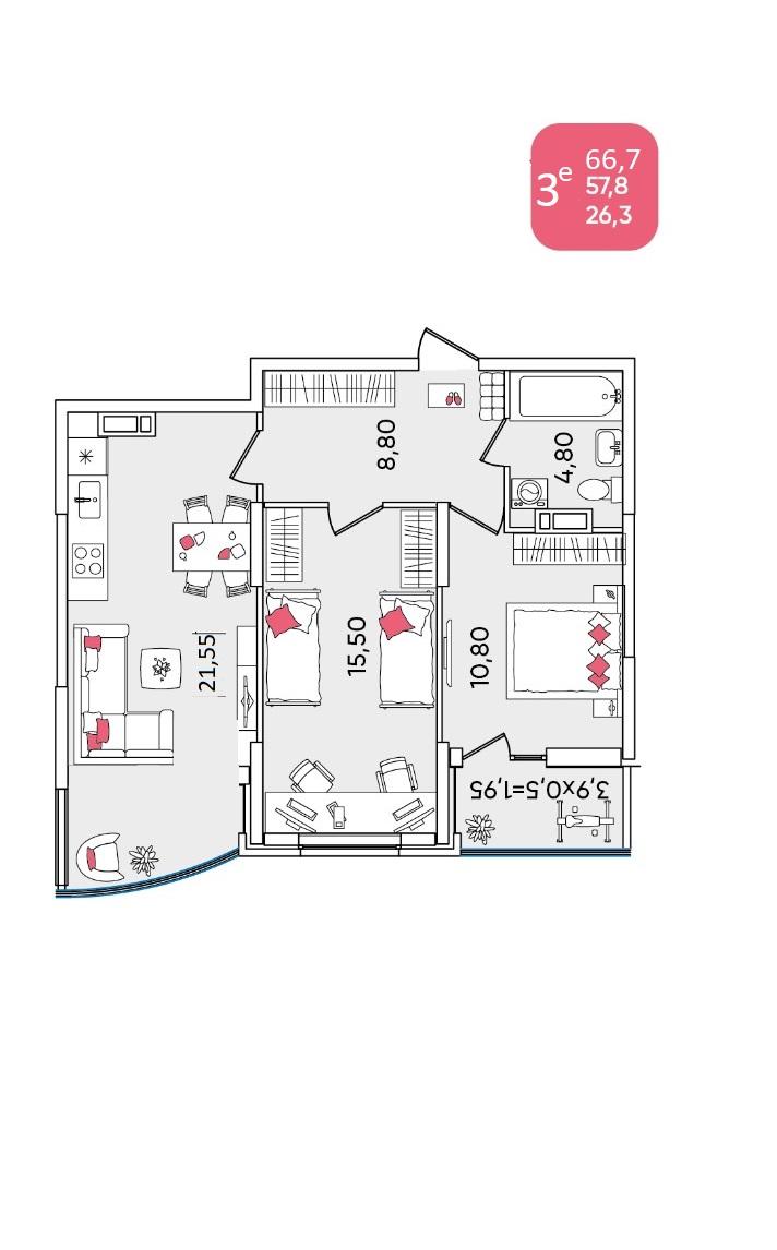 Продается 3-х комн. новостройка, 66 кв.м., 8/16 эт