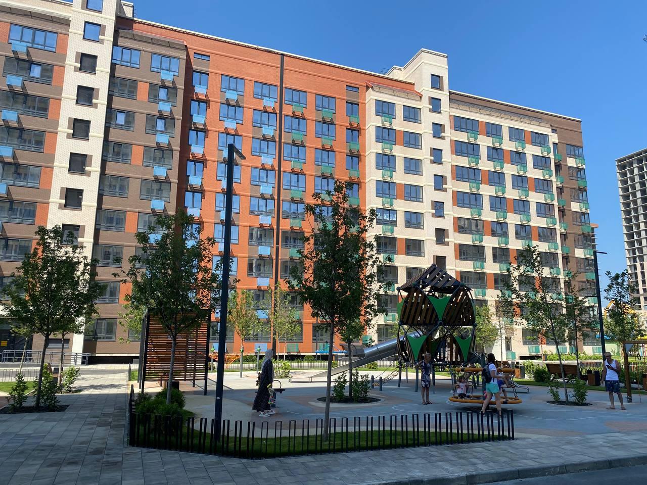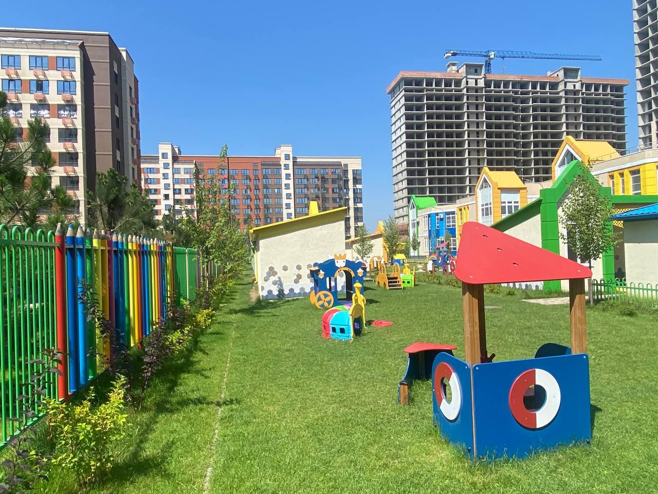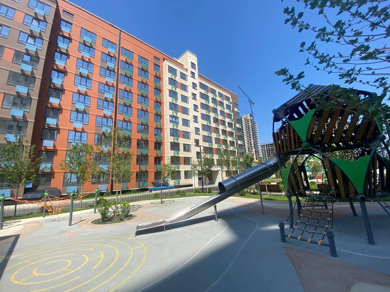 колясочная зона и помывочная для лап собачек .так же есть площадки для собак. продуманный ландшафтный красочные детские площадки и, много зелени и свежего воздуха.