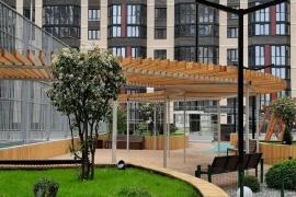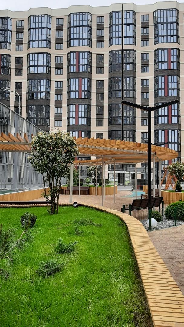 Придомовая территория ландшафтный дизайн,2-х уровневый стилобат,с детскими площадками и зонами отдых,удобный выезд и города.