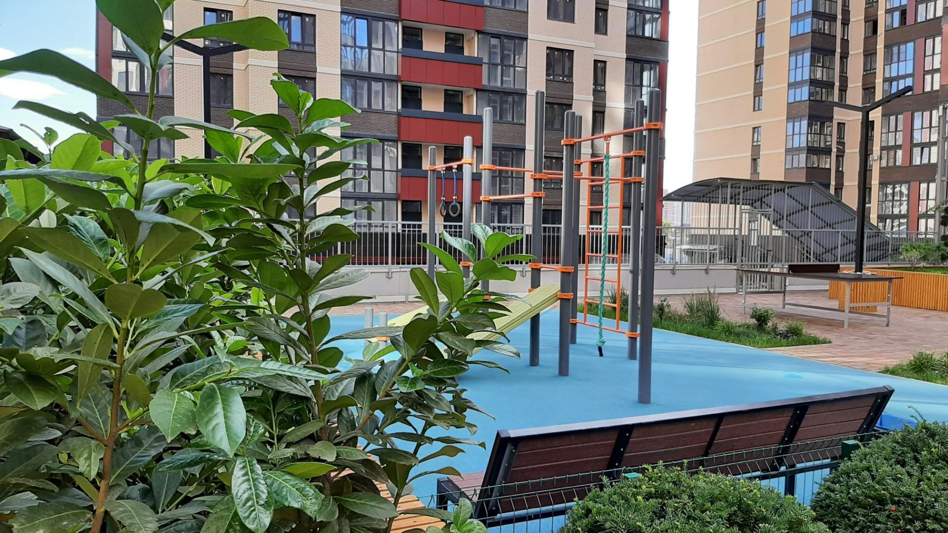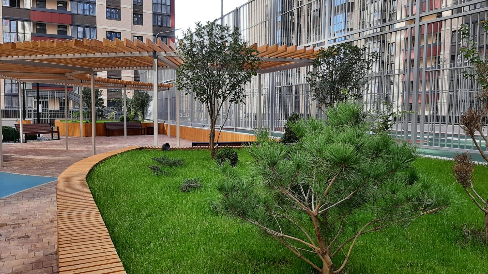 Придомовая территория ландшафтный дизайн,2-х уровневый стилобат,с детскими площадками и зонами отдых,удобный выезд и города.