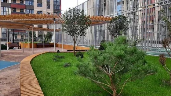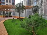 Придомовая территория ландшафтный дизайн,2-х уровневый стилобат,с детскими площадками и зонами отдых,удобный выезд и города.