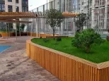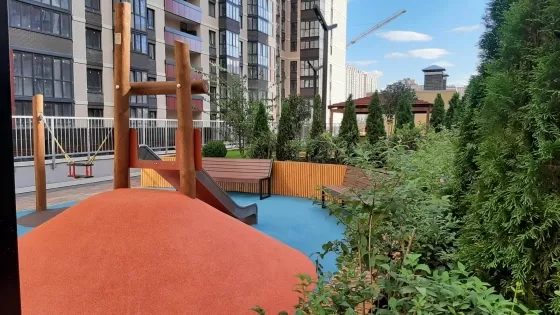 Придомовая территория ландшафтный дизайн,2-х уровневый стилобат,с детскими площадками и зонами отдых,удобный выезд и города.