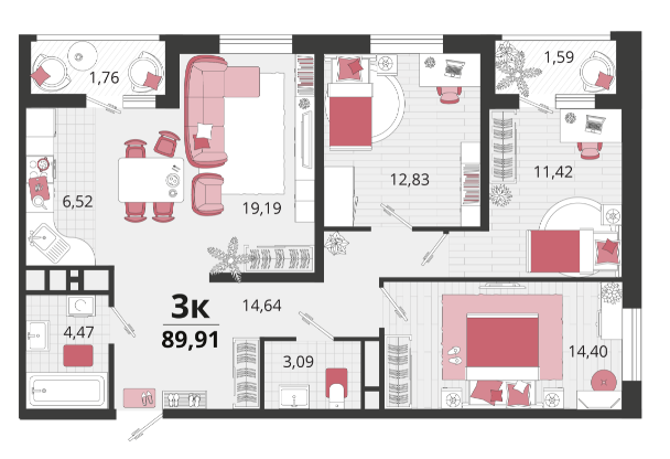 Квартира в предчистовой отделке, площадью 90м2,с большой кухней-гостинной 27м2.
