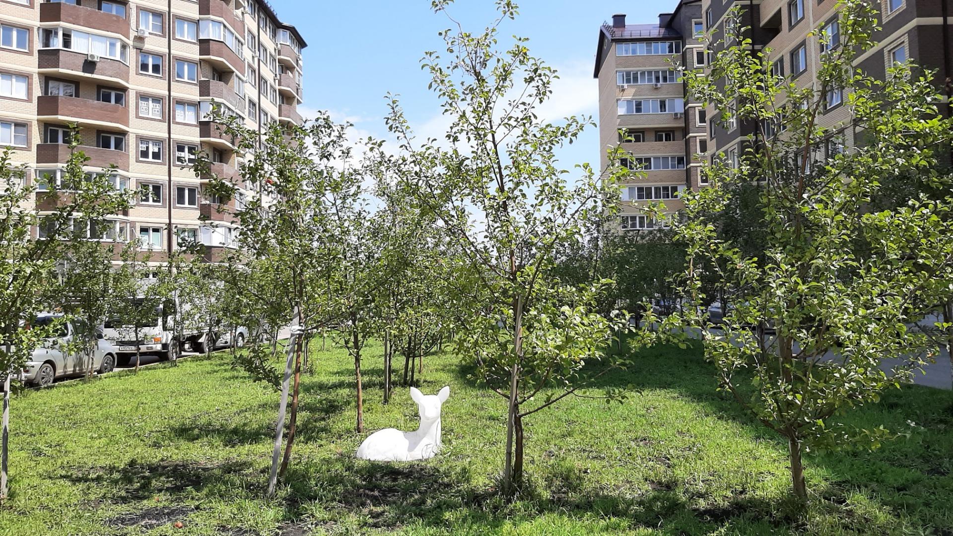 На территории разбит яблоневый сад,2 теннисных корта,наземный паркинг,современные детские площадки,закрытая площадка для выгула собак.
