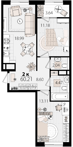 Квартира для большой семьи,площадью 60м2 с современным Евроремонтом и большой кухней-гостинной 18м2