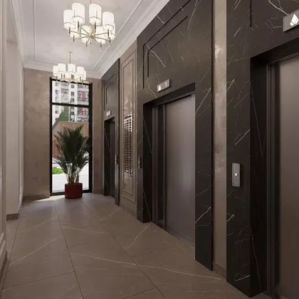 Входные группы домов выполняются по индивидуальному дизайн проекту и включают в себя: колясочные и велосипедные комнаты, зону консьержа, от двух до трех высокоскоростных, бесшумных лифтов компании ОТIS.