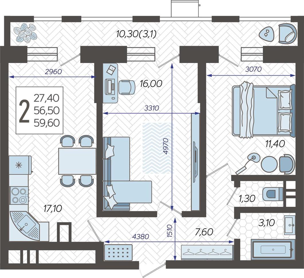 Продается 2-х комн. новостройка, 56.6 кв.м., 4/12 эт