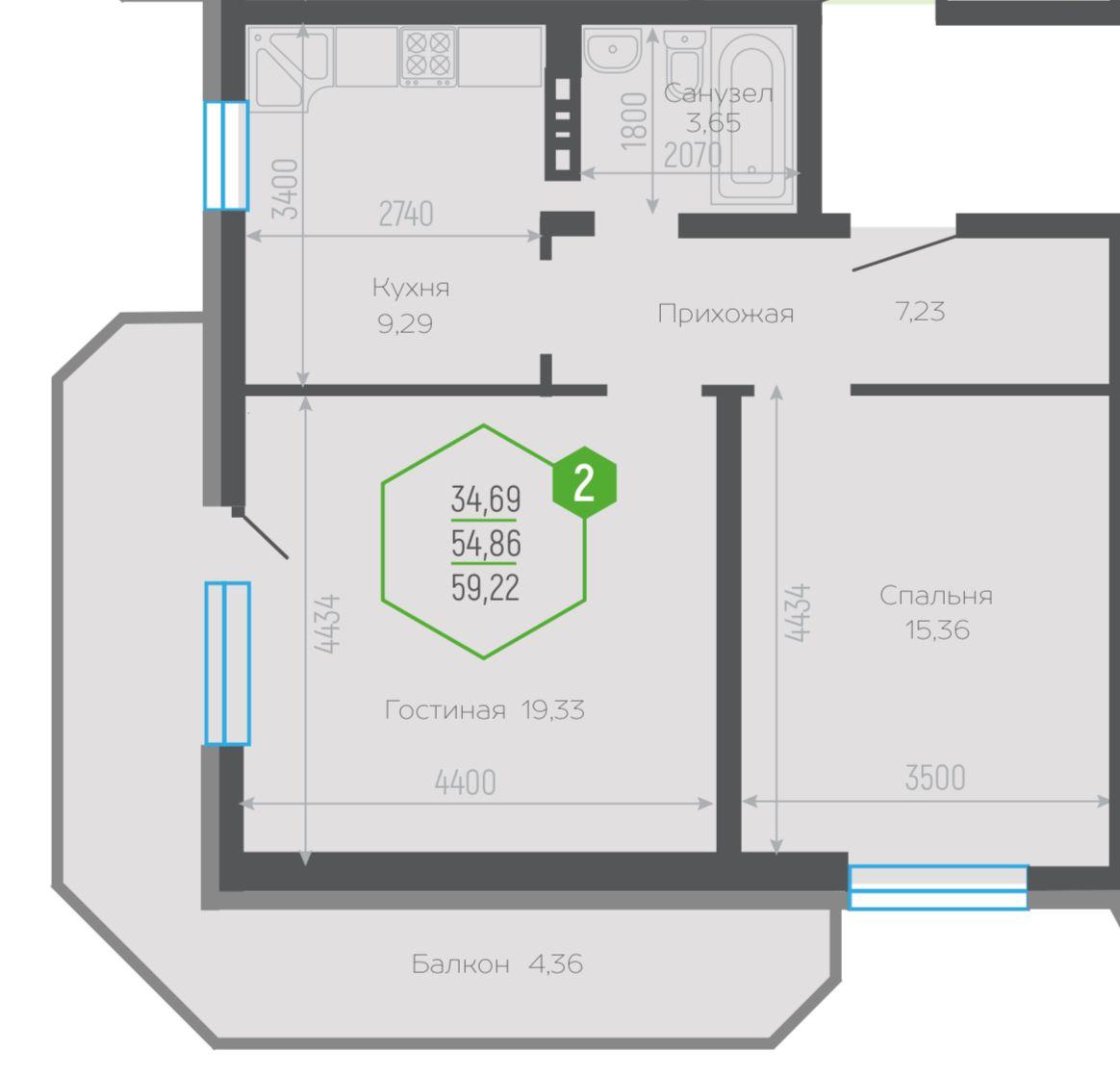 Продается 2-х комн. новостройка, 59.22 кв.м., 3/19 эт