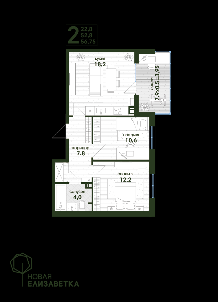 Продается 2-х комн. новостройка, 56.75 кв.м., 3/4 эт