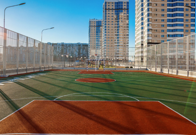 Во дворе 3 детских площадки,скейтпарк,зона отдыха с лавочками,ландшафтное озеленение,зона барбекю,камеры видеонаблюдения.