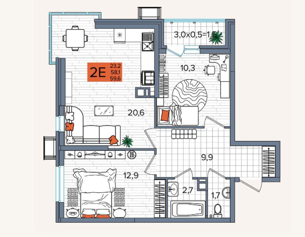 Продается 3-х комн. новостройка, 59.6 кв.м., 2/16 эт