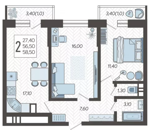 Продается 2-х комн. новостройка, 59.71 кв.м., 1/12 эт