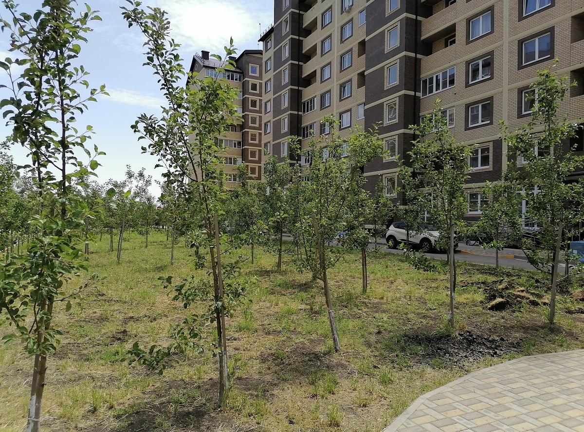 На первой линии ЖК высажен молодой яблоневый сад, красивая аллея с зонами отдыха. Много парковочных мест, двор вымощен плиткой, красочные безопасные детские площадки ограждены от проезжей части. На территории ЖК остановка общественного транспорта, быстрый выезд на трассу М-4, а это значит выезд на море, в город и из города.