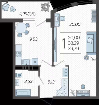 Продается однокомнатная новостройка, 39.79 кв.м., 4/21 эт