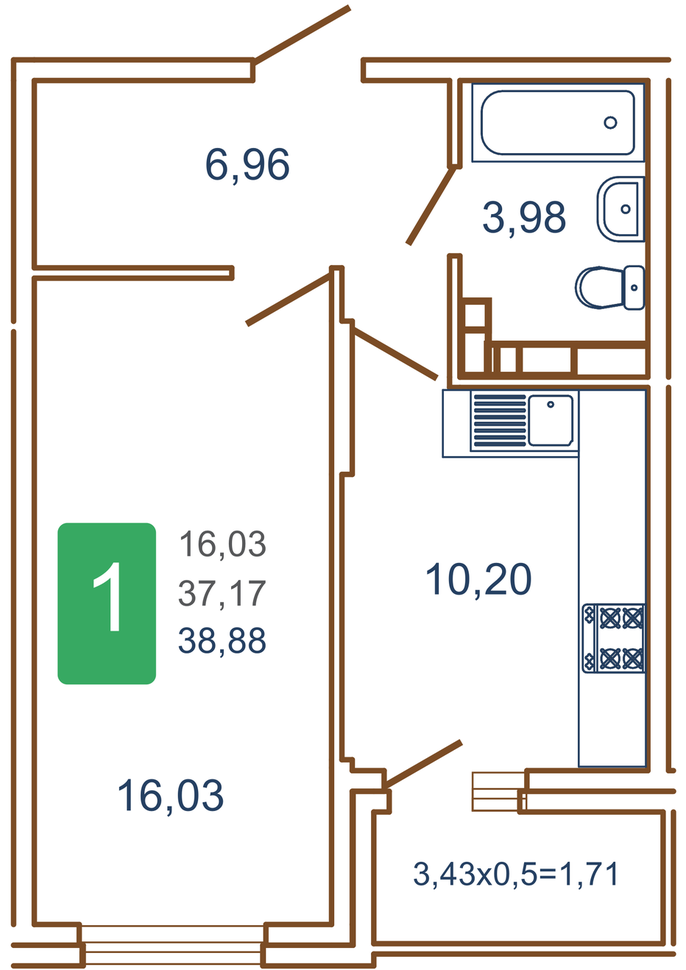 Продается однокомнатная новостройка, 38.88 кв.м., 16/16 эт