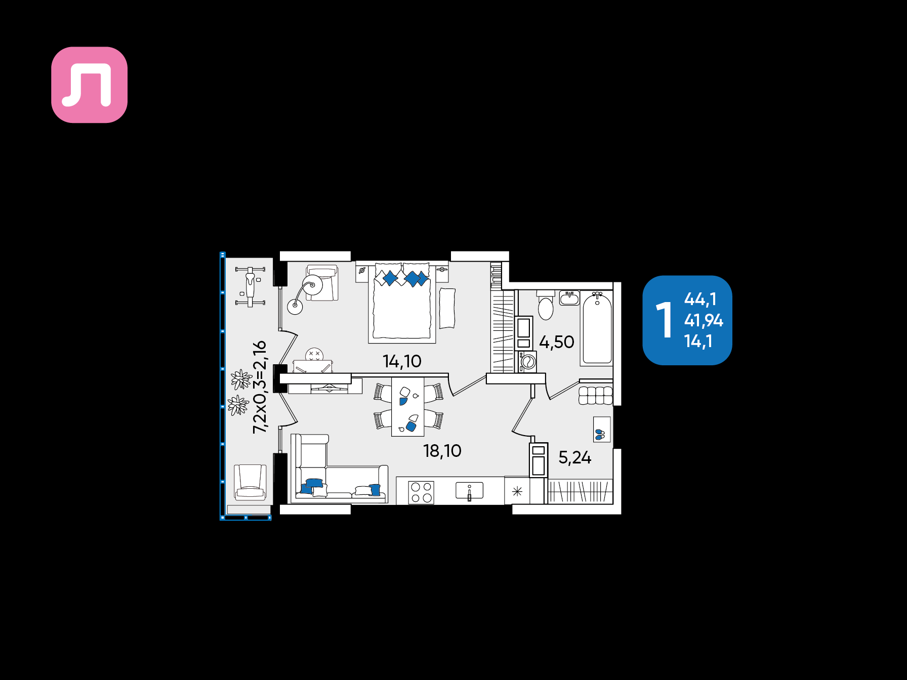 | Площадь, кв.м. | 44.1 |