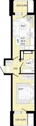 Продается однокомнатная новостройка, 43.16 кв.м., 9/18 эт