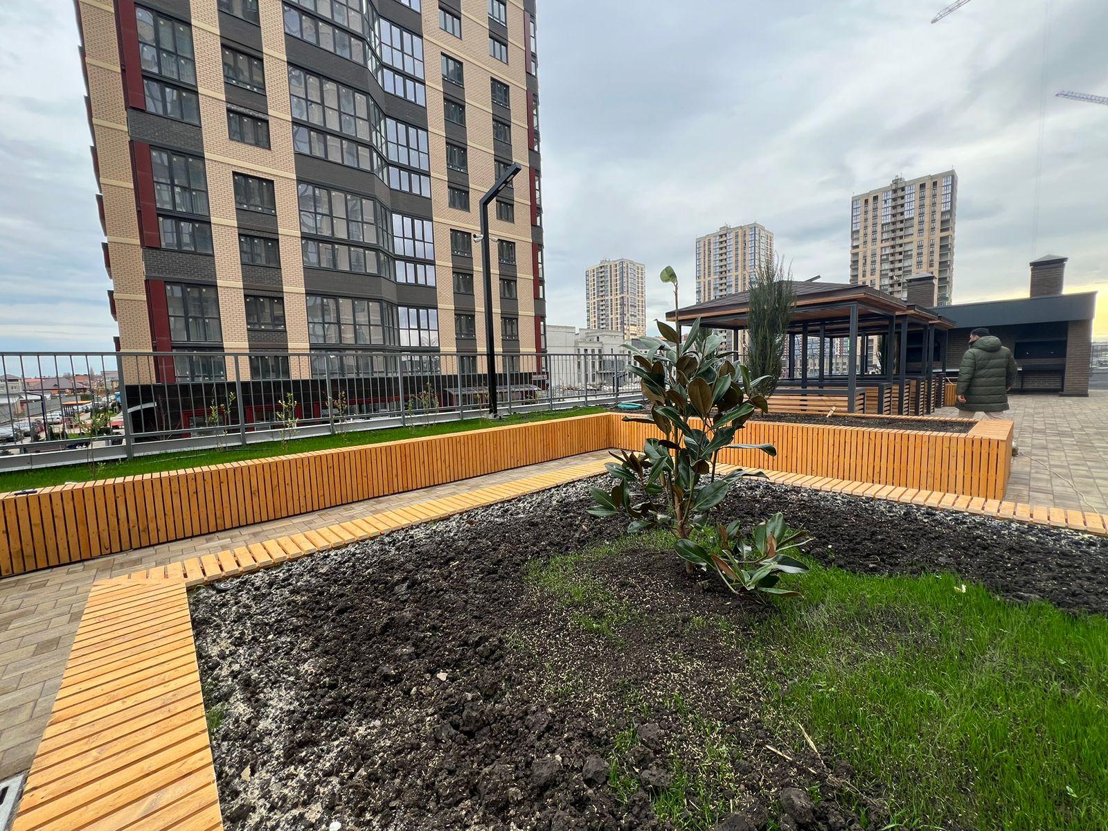 Часть домов будут иметь уникальную конструкцию двора в формате стилобата, на котором размещаются многофункциональная площадка для игры в футбол, баскетбол, волейбол, воркаут зона, столы для настольного тенниса, современные площадки для детей, ландшафтный дизайн, зона для творчества и зона барбекю с беседками для пикника с точками для мытья посуды и рук. Во дворах доступен Wi-Fi и зоны для зарядки гаджетов. Размещены сан. узлы.