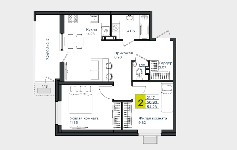 Продается 2-х комн. новостройка, 54.23 кв.м., 8/8 эт
