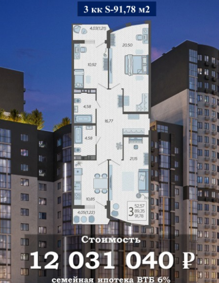 Продается 3-х комн. новостройка, 91.78 кв.м., 4/21 эт