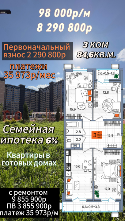 Продается 3-х комн. новостройка, 86 кв.м., 3/17 эт