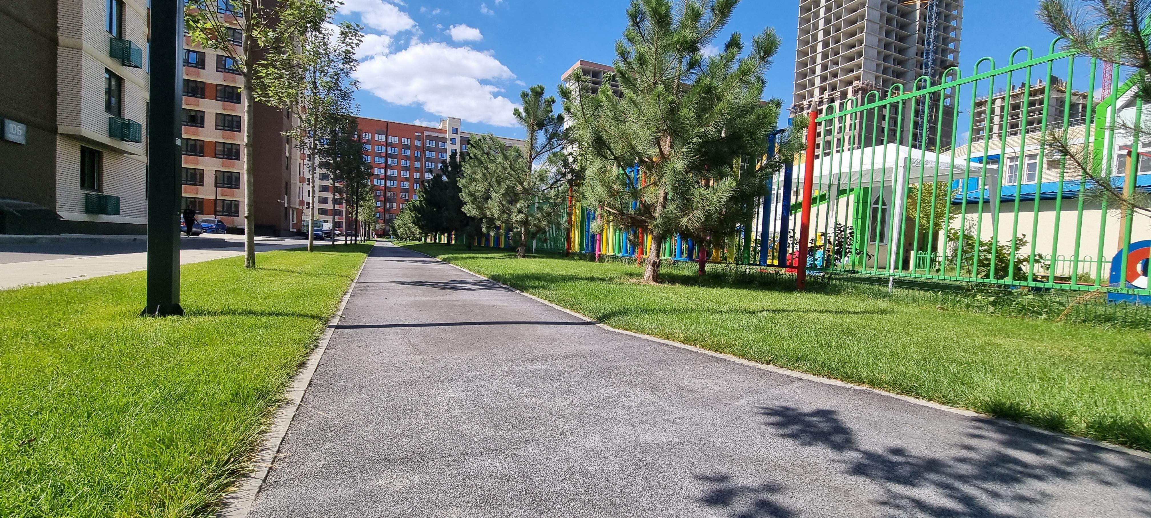 На территории расположен уже действующие детские сады, современная новая школа. Поликлиника, храм.