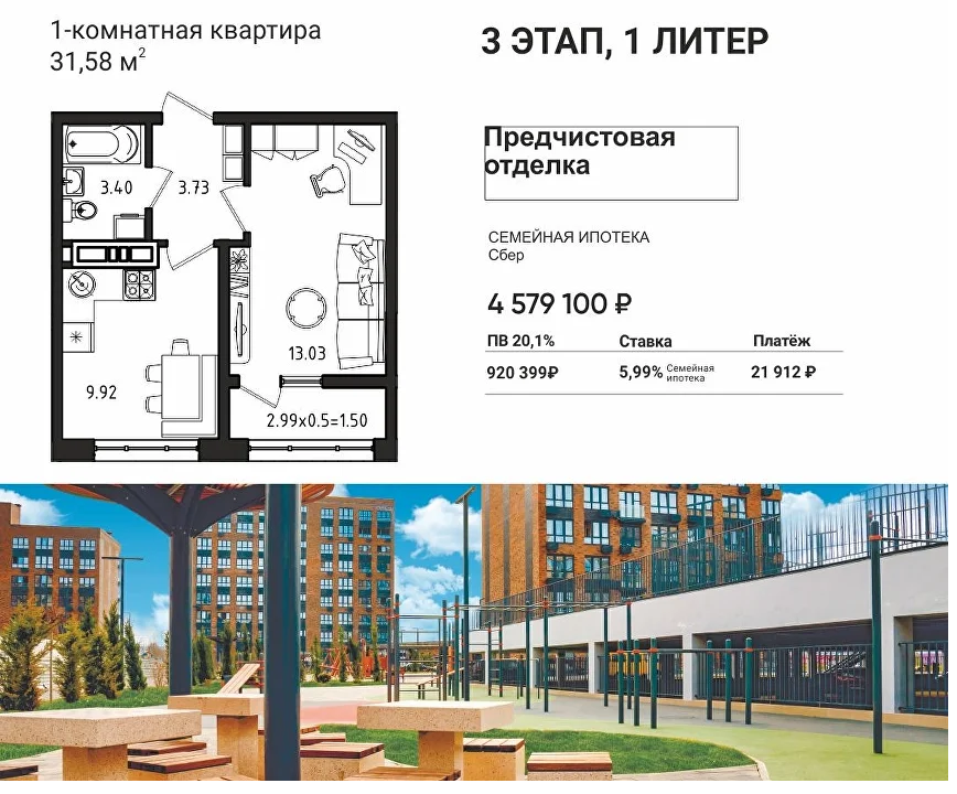Продается однокомнатная новостройка, 31.58 кв.м., 8/9 эт