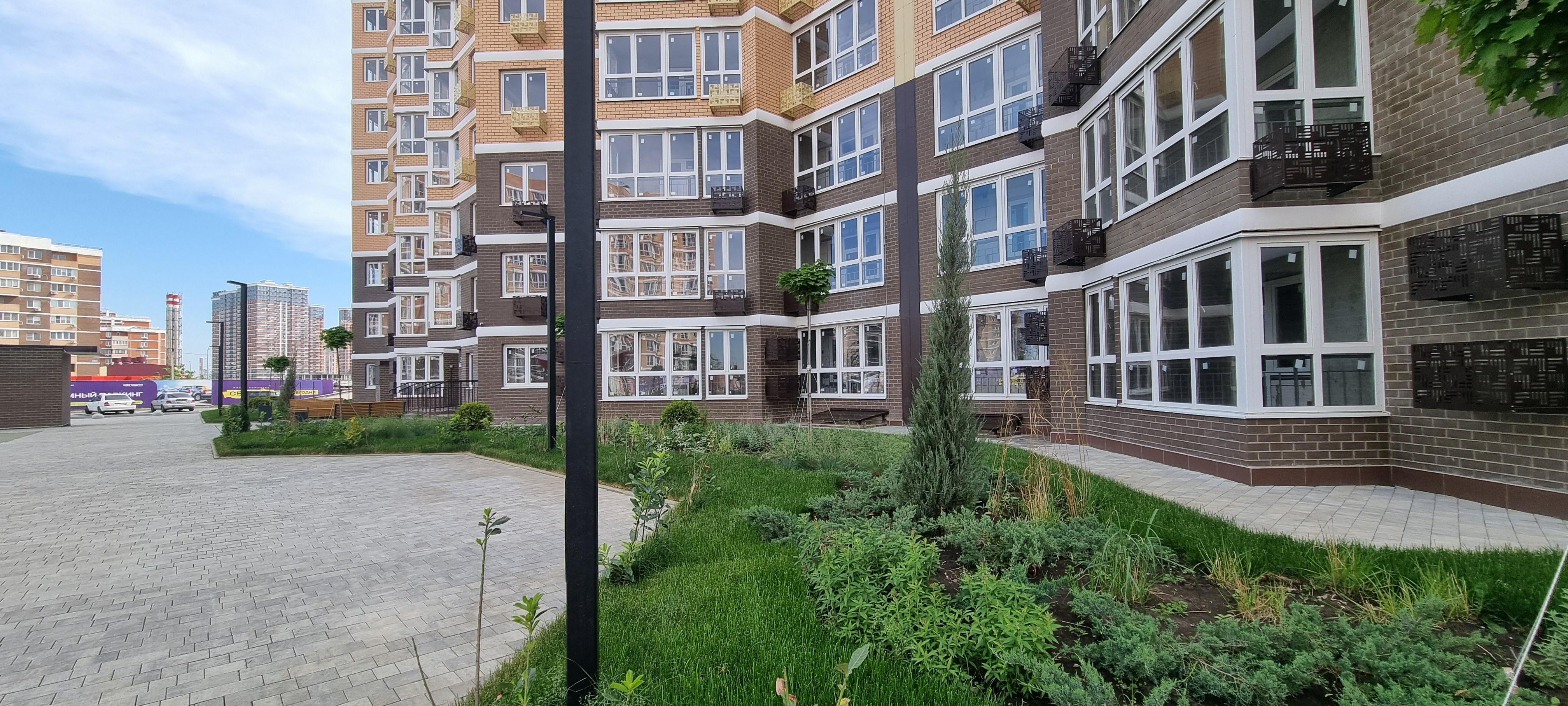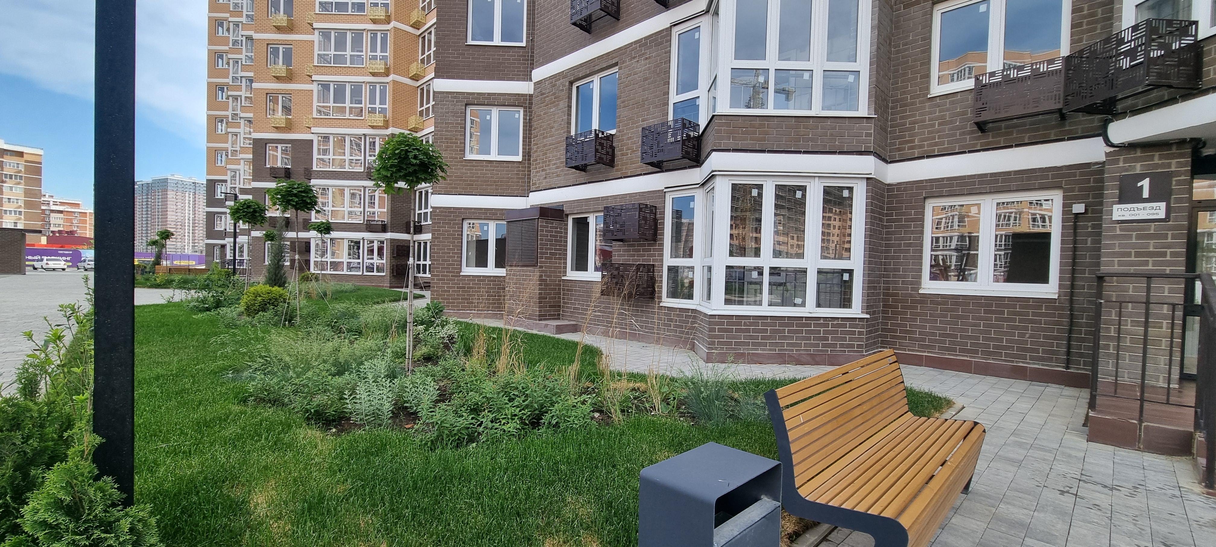 На территории комплекса построена зелена зона для прогулок и отдыха жителей.