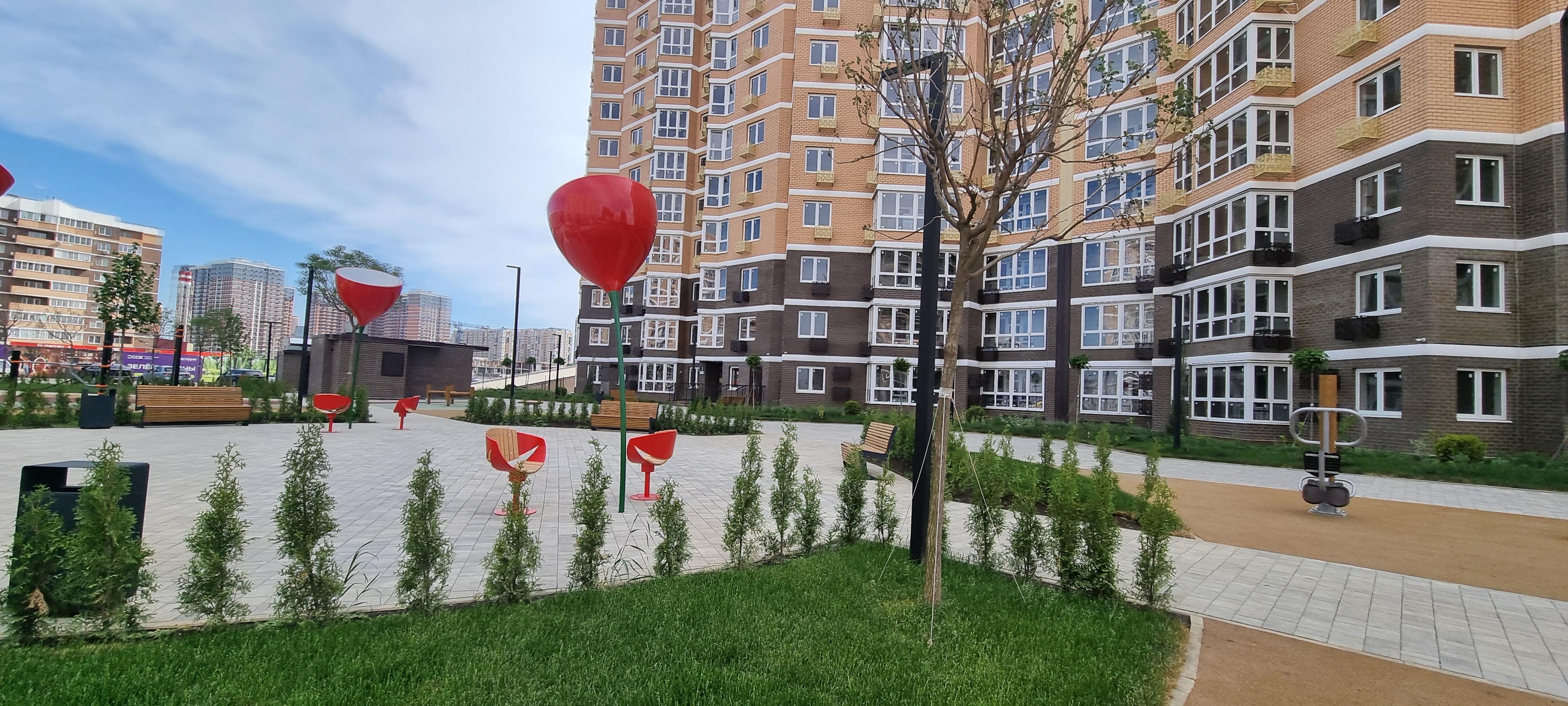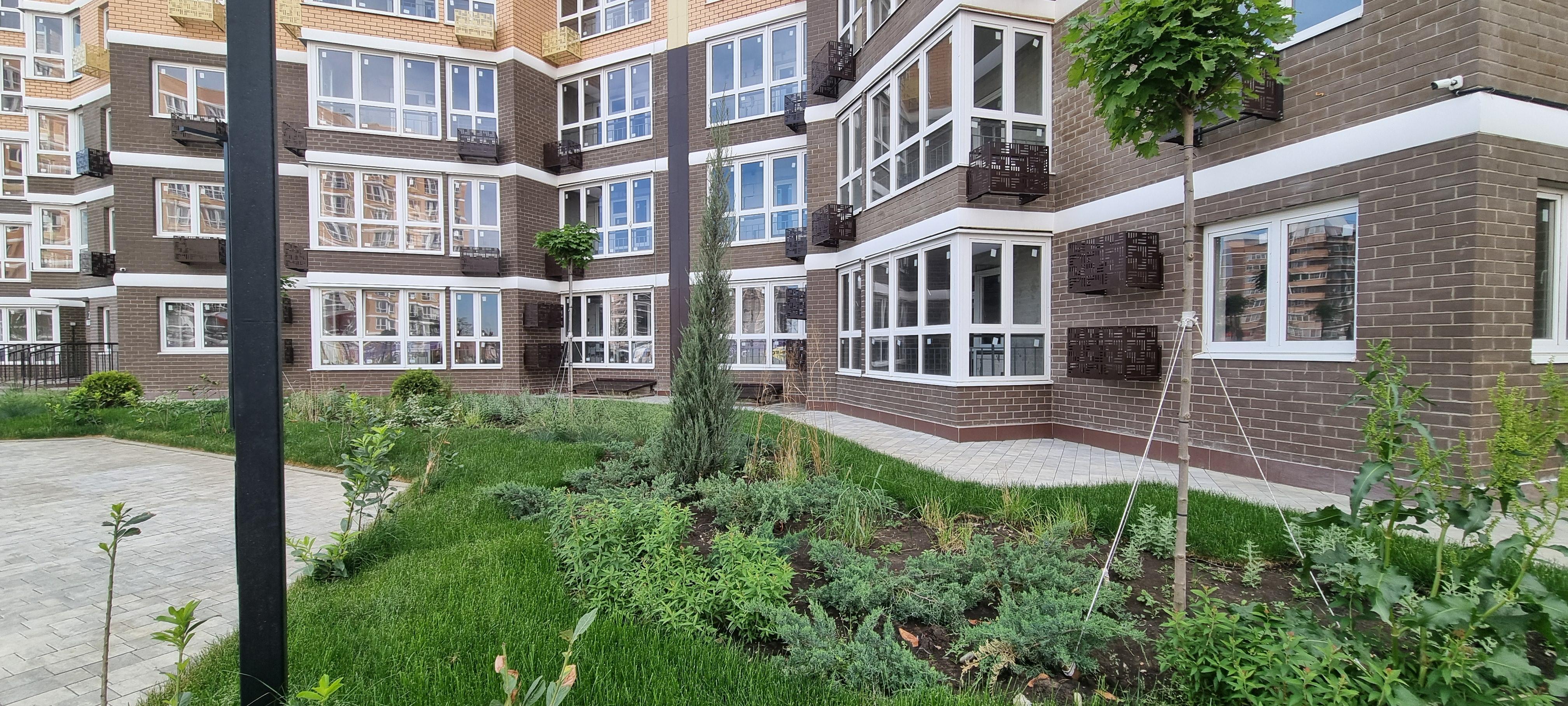На территории комплекса построена зелена зона для прогулок и отдыха жителей.