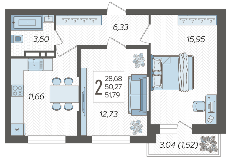 Продается 2-х комн. новостройка, 51.79 кв.м., 14/16 эт