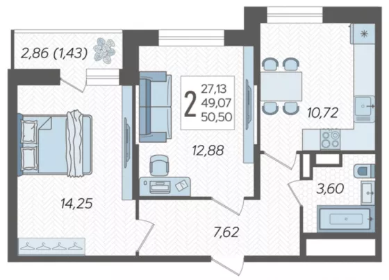 Продается 2-х комн. новостройка, 50.5 кв.м., 13/16 эт