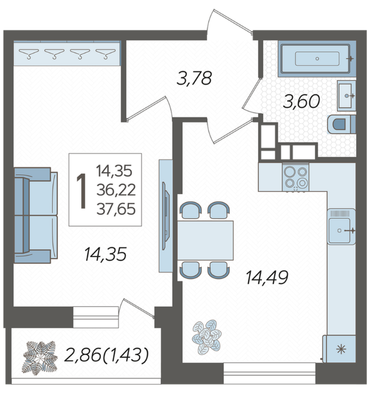 Продается однокомнатная новостройка, 37.65 кв.м., 14/19 эт