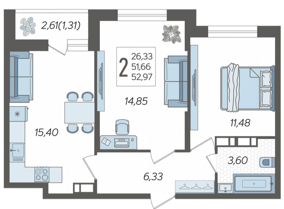Продается 2-х комн. новостройка, 52.97 кв.м., 16/19 эт