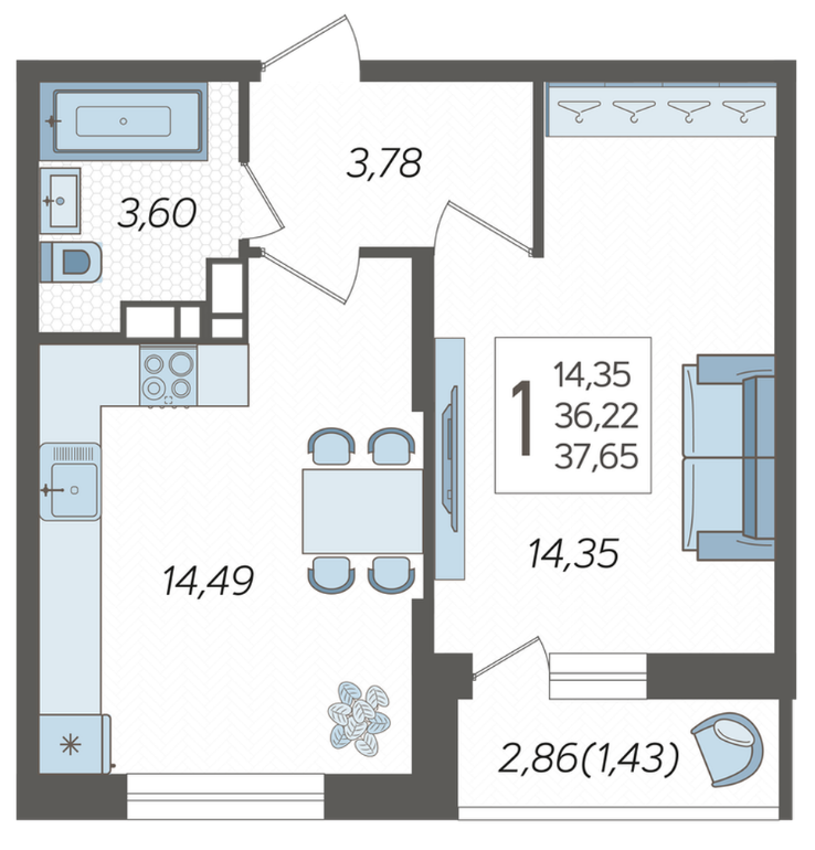 Продается однокомнатная новостройка, 37.65 кв.м., 18/19 эт