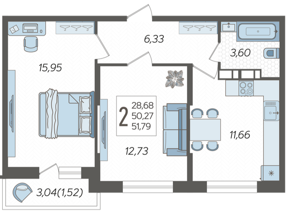 Продается 2-х комн. новостройка, 51.79 кв.м., 12/19 эт