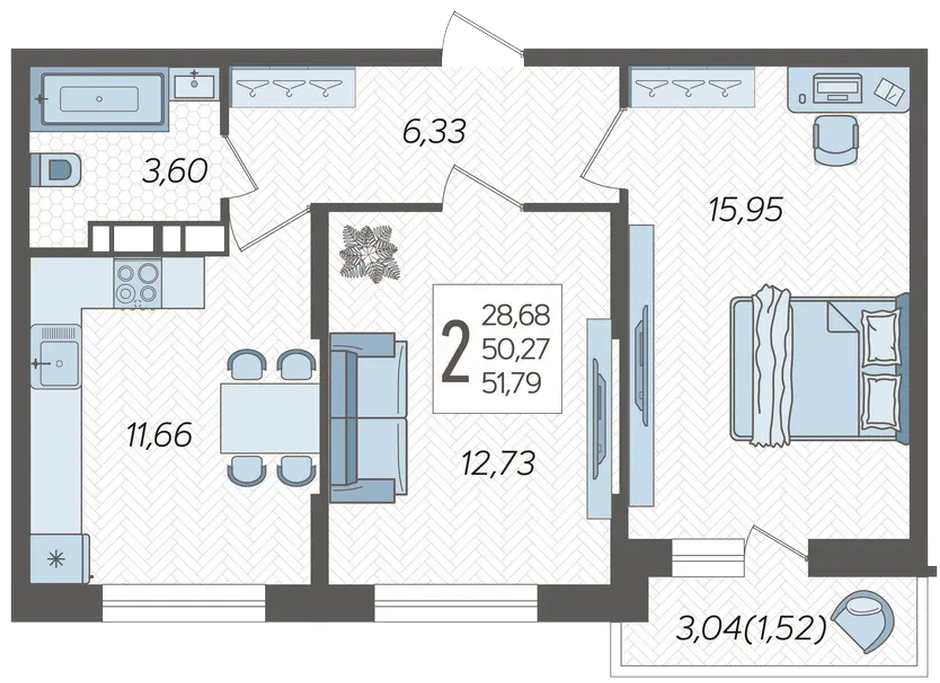 Продается 2-х комн. новостройка, 51.79 кв.м., 10/19 эт