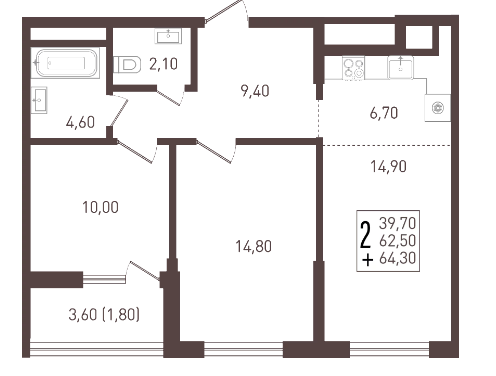 Продается 2-х комн. новостройка, 64.3 кв.м., 6/8 эт