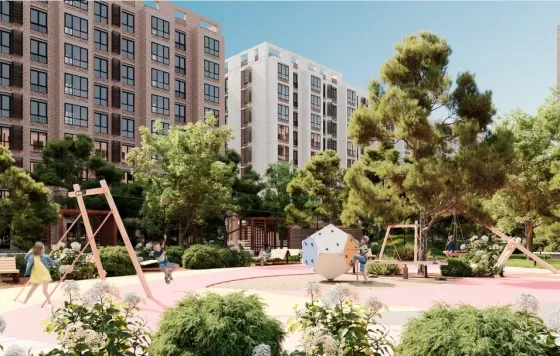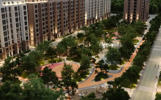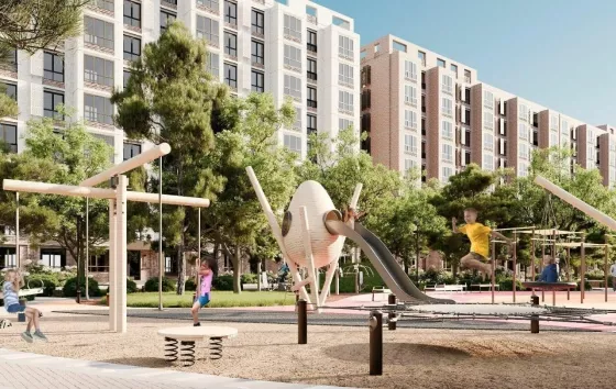 Закрытая территория, двор без машин, детские и спортивные площадки, зоны отдыха, прогулочные аллеи, фонтан, зоны коворкинга, безбарьерная среда, свой детский сад с бассейном.
