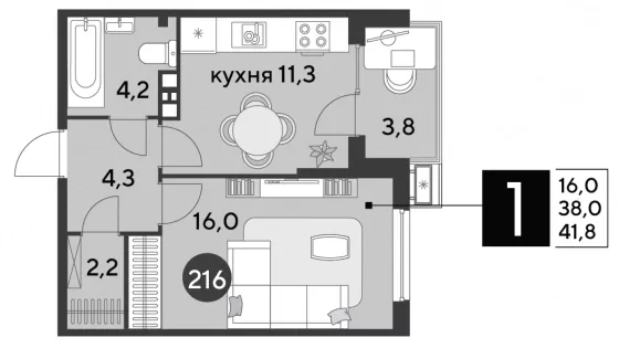 Продается однокомнатная новостройка, 42 кв.м., 12/18 эт
