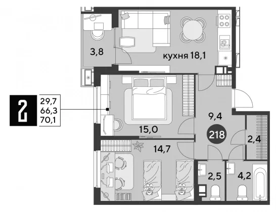 Продается 2-х комн. новостройка, 70 кв.м., 15/18 эт