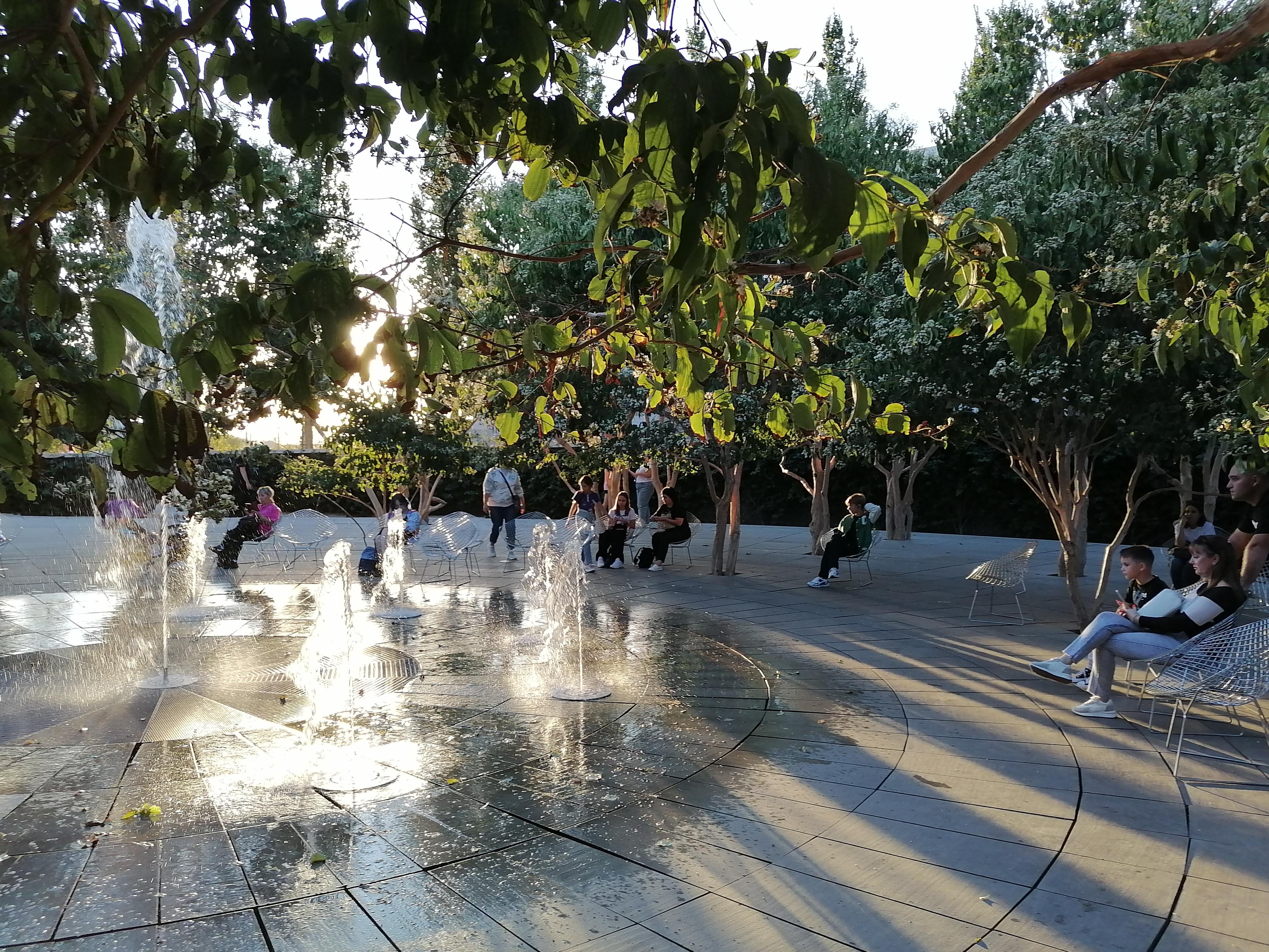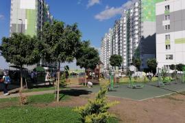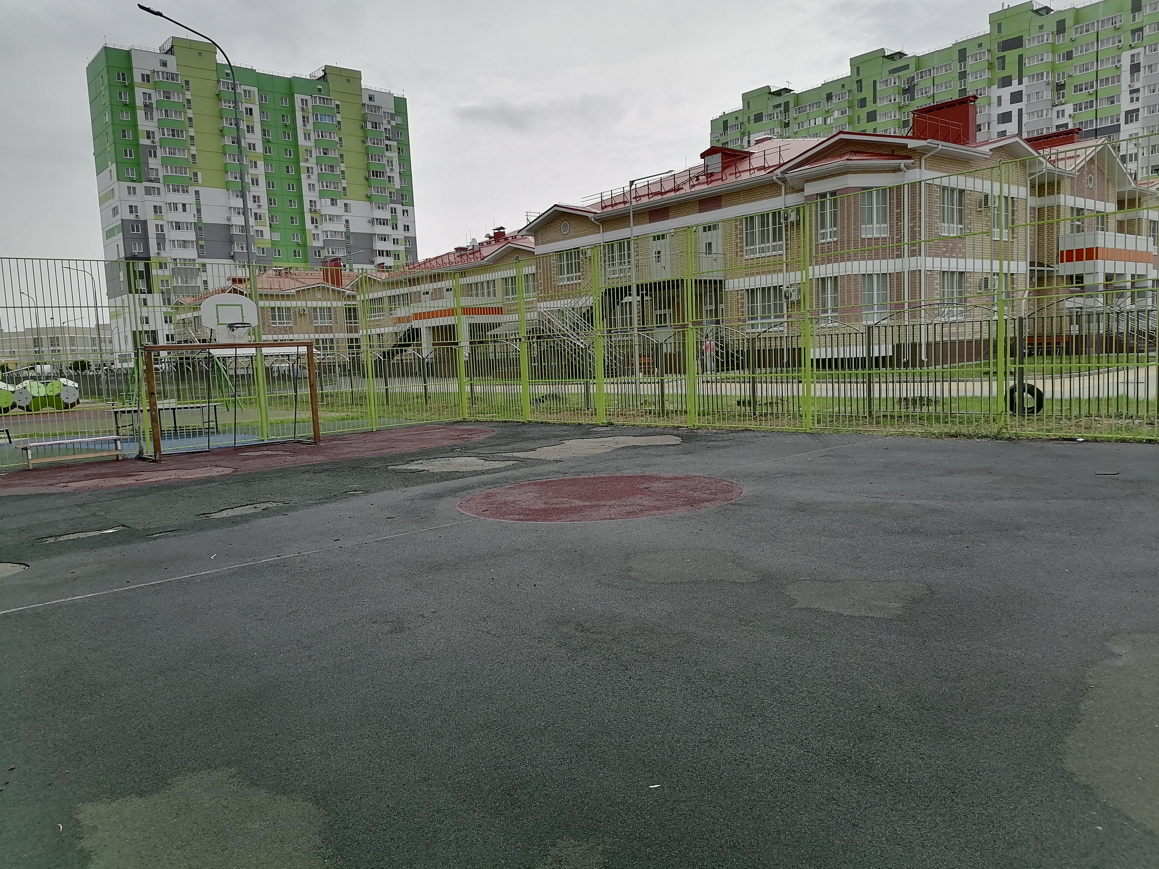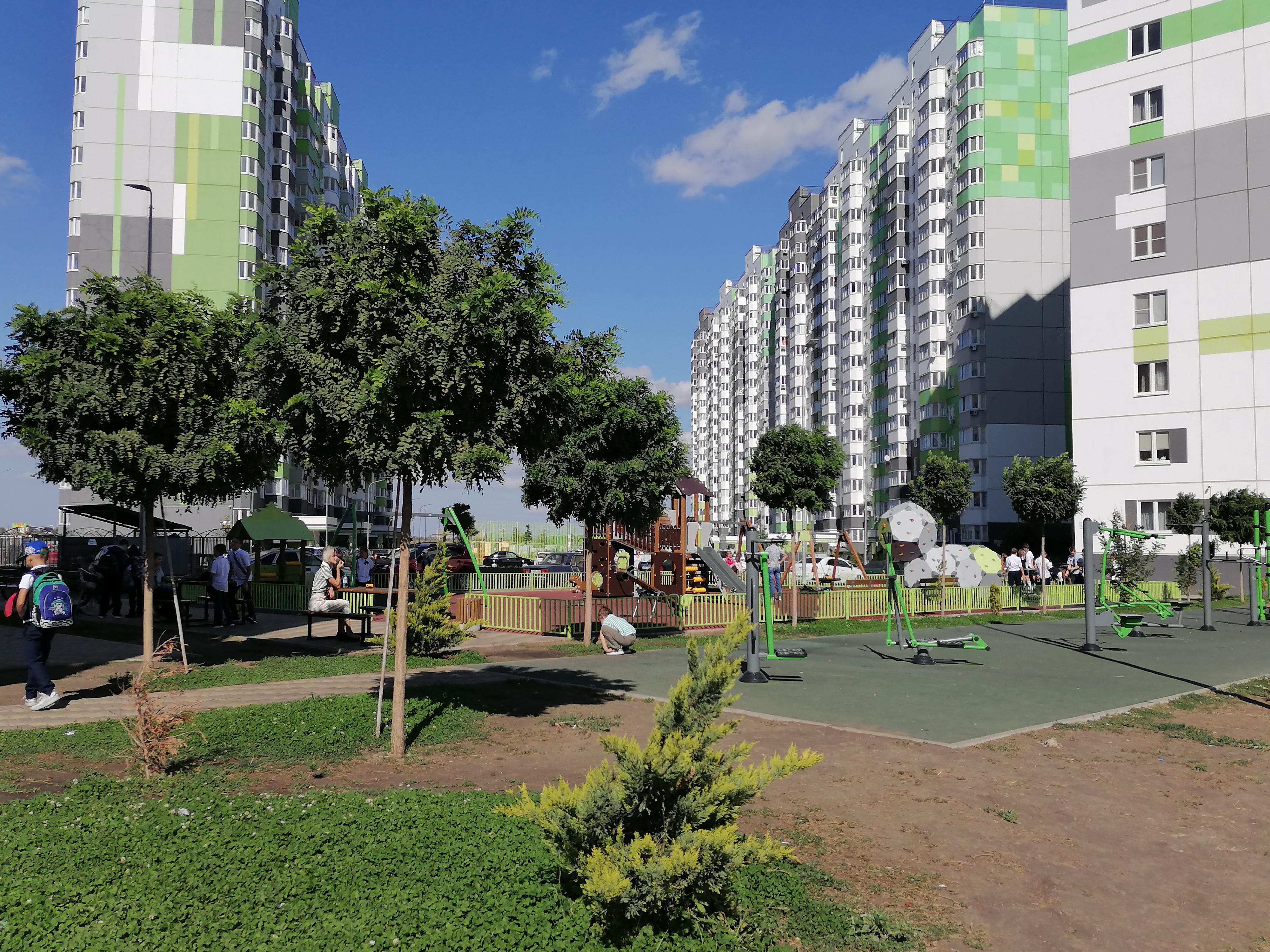 Большое расстояние между домами, много места для парковки автомобилей, также есть многоуровневая стоянка. Двор с красочными детскими и спортивными площадками, скамейками для отдыха и зелеными кустарниками и деревьями.
