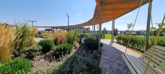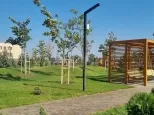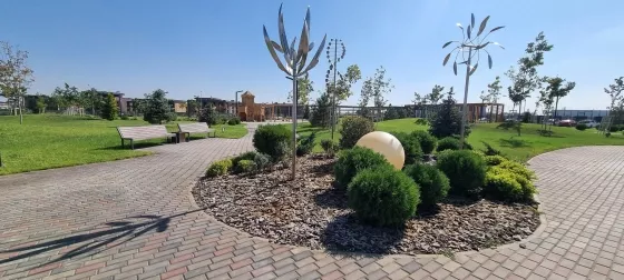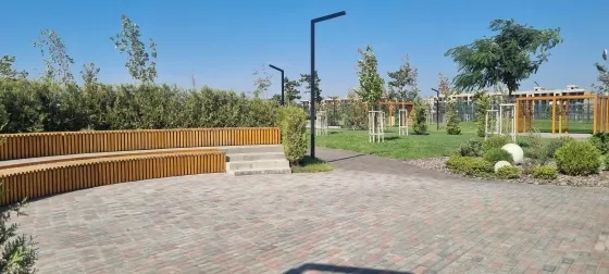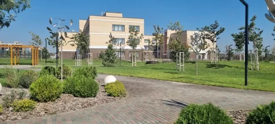 Сквер для прогулок с детскими площадками и зонами для спорта. Школа и детский сад уже принимают детей.