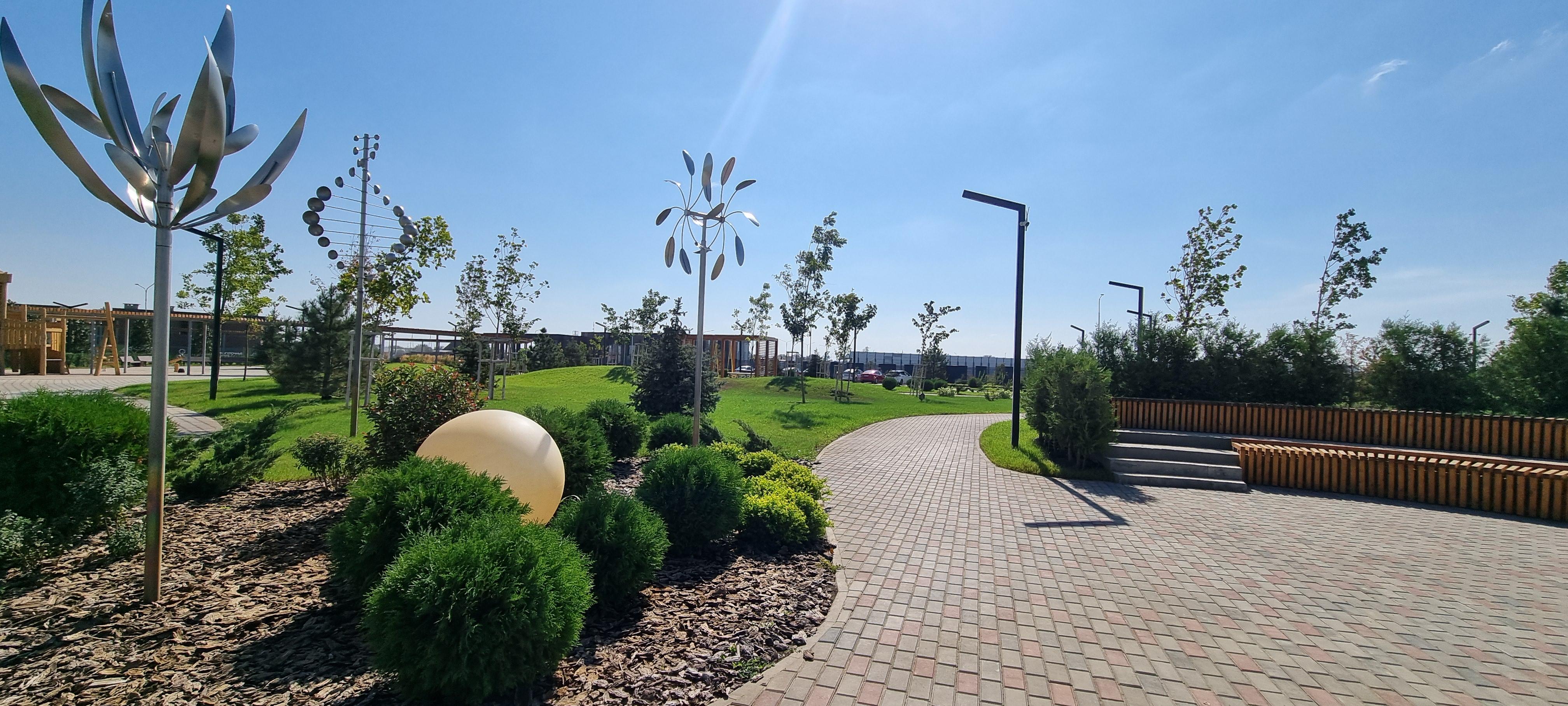 Сквер для прогулок с детскими площадками и зонами для спорта. Школа и детский сад уже принимают детей.