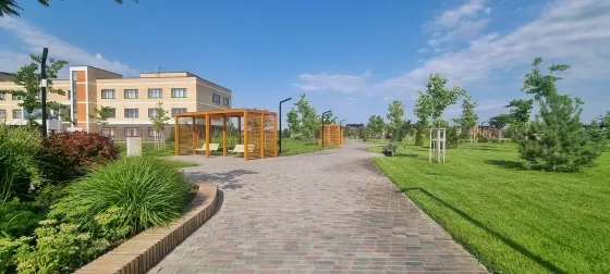 Сквер для прогулок с детскими площадками и зонами для спорта. Школа и детский сад уже принимают детей.